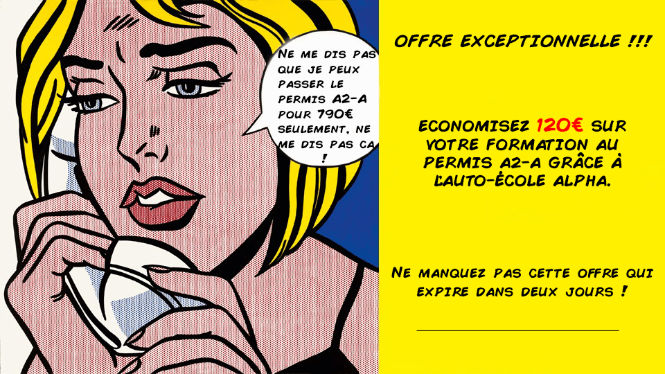 En effet, vous avez la possibilité de passer le permis A2-A sans le code pour 790€ au lieu de 950€. N’attendez plus car cette offre expire dans deux jours.